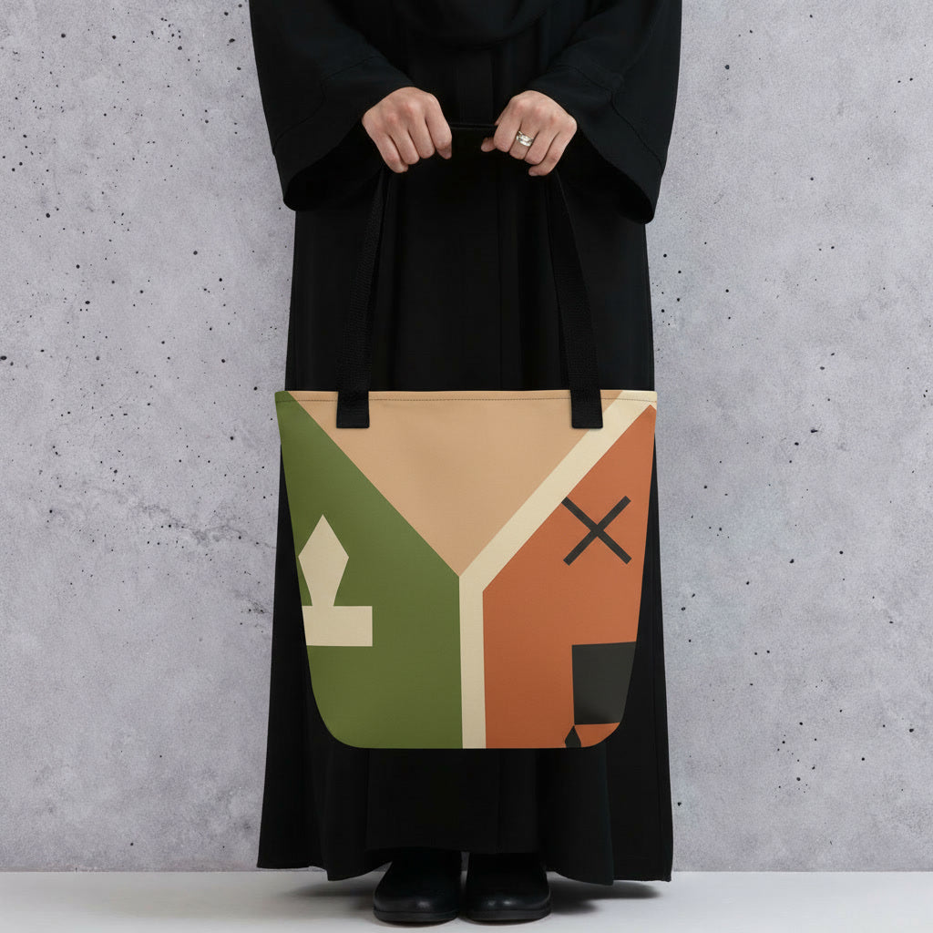 Embrace your heritage with this trendy tote from The Origin Collection, featuring bold Moroccan geometric shapes reimagined in an urban streetwear style. Muted earth tones of olive green, terracotta brown, and beige create abstract layered patterns with a stylized diamond and cross motif, making it a stylish accessory for young Muslim creatives on the go.